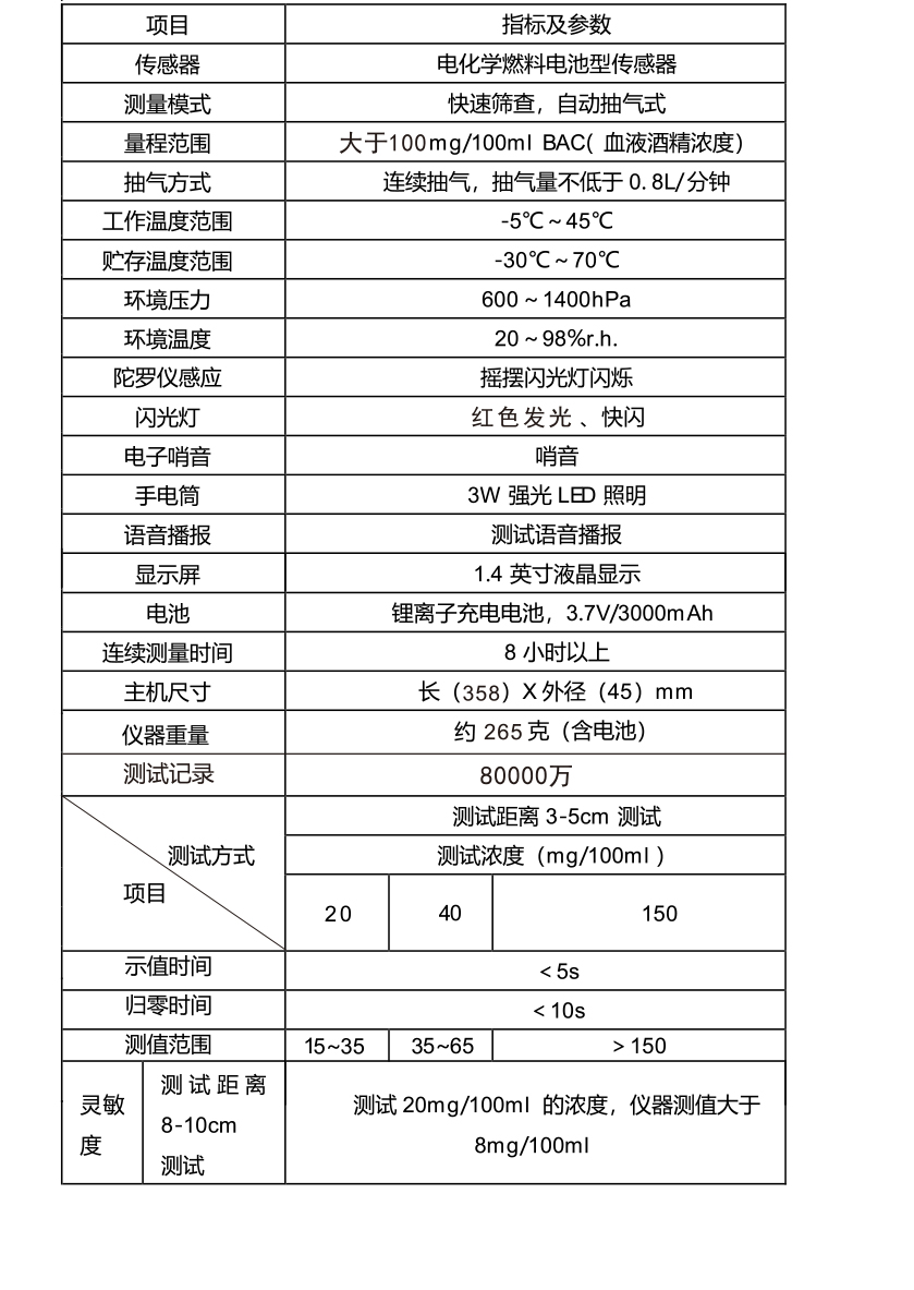 趴在連續(xù)測試時應(yīng)間隔10秒 以上或者更長時后再次測量。 如測試結(jié)果大于lOOmg/lOOml時下一次測試需建議間隔時 間更長一些,建議過一分鐘后測試。以便讓傳感器充分歸零。