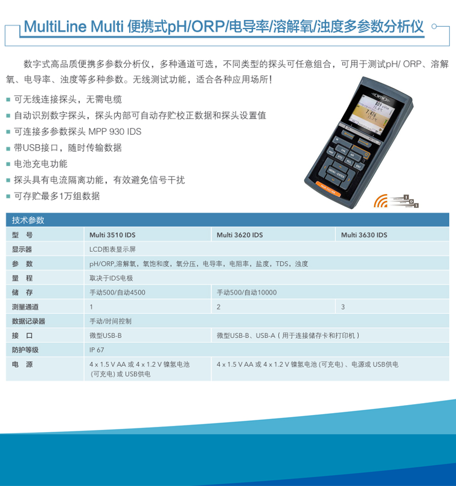 Multi 3510/3620/3630 IDS多參數水質檢測儀分析儀便攜式IDS數字技術多參數水質檢測儀器,帶通用的接口用于連接IDS傳感器,可無線連接探頭,無需電纜;自動識別數字探頭,探頭內部可自動存貯校正數據和探頭設置值;德國WTW Multi 3510/3620/3630 IDS數字化多參數水質分析儀探頭具有電流隔離功能,有效避免信號干擾。