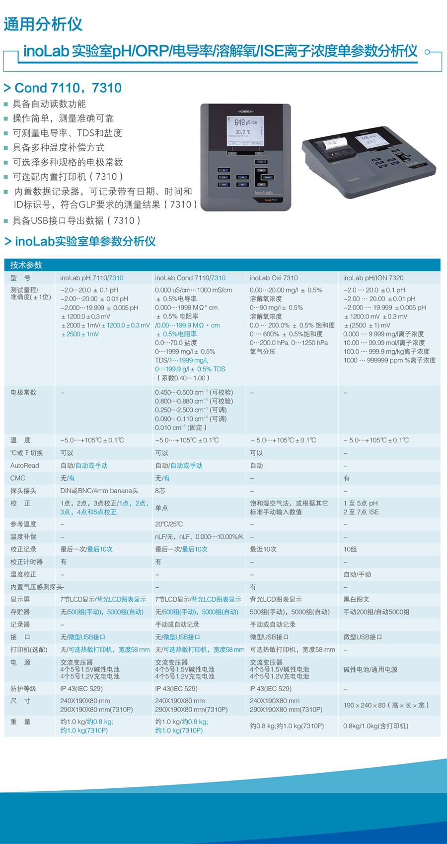 inoLab® Cond 7310 實驗室精密電導率測定儀,僅主機,含電源適配器,支架和操作手冊,軟件和USB電纜 |
