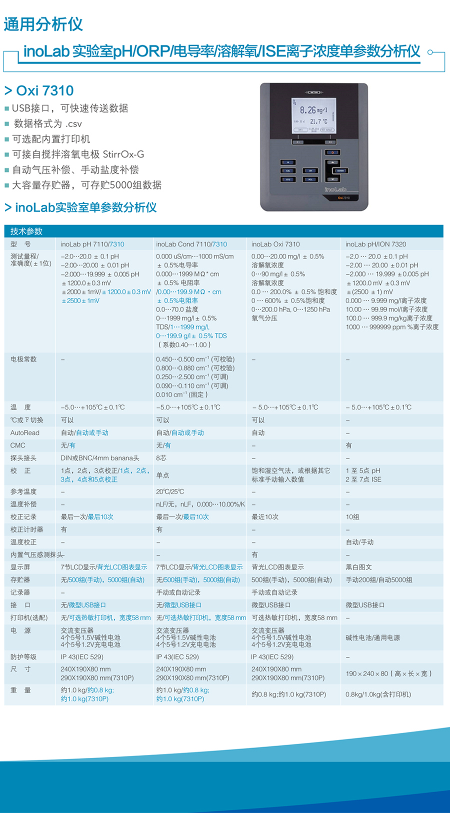 inoLab Oxi7310實驗室溶氧儀較新型號,替代原有型號Oxi 730。該款儀器非常適合常規的實驗室分析測試。它界面非常直觀,按鍵和面板容易清潔,Oxi 7310無論是在環保、化工、制藥、醫療還是用于地表水,漁場測量,都可以快速準確地提供溶解氧,氧飽和度和氧分壓的測量值。inoLab® Oxi 7310系列都提供了具有先進功能并易于使用的成套配置。直觀的用戶界面和易清洗的外殼和鍵盤是適用于實驗室的理想選擇。