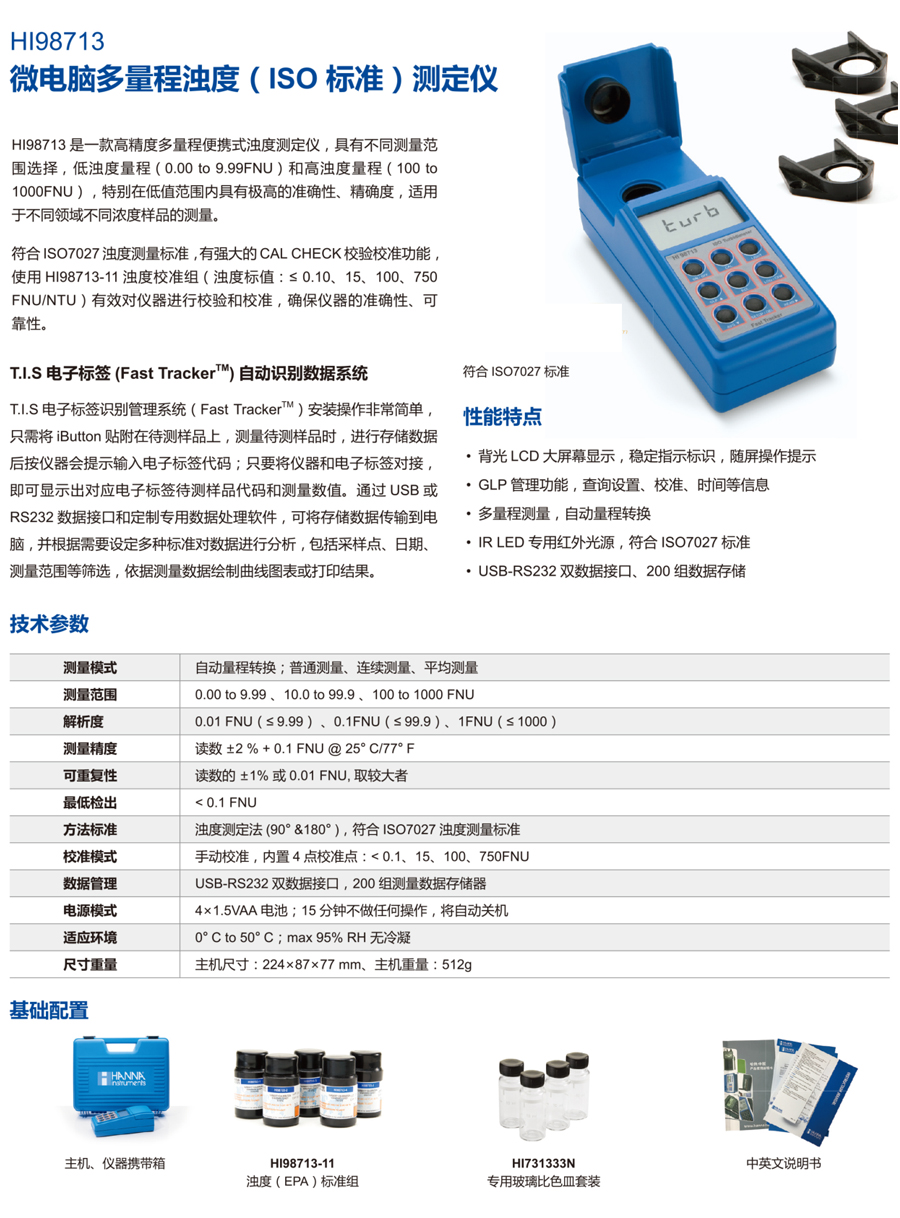 主機(jī),HI98713-11 定制專用濁度(ISO)標(biāo)準(zhǔn)組(標(biāo)值@25°C:≤ 0.1、15、100、750 FNU),HI731333N 專用玻璃比色皿套裝,HI93703-58 玻璃比色杯潤(rùn)滑劑,HI920005 T.I.S電子標(biāo)簽(5個(gè)),HI710006 AC230V/12VDC 電源適配器,中英文使用說(shuō)明書,HI710134 定制專用儀器攜帶箱【溫馨提示:建議訂購(gòu)HI93703-50比色皿清潔液和HI731318玻璃比色皿清潔布,用于玻璃比色皿清潔修復(fù),確保測(cè)量精度和讀數(shù)準(zhǔn)確度】