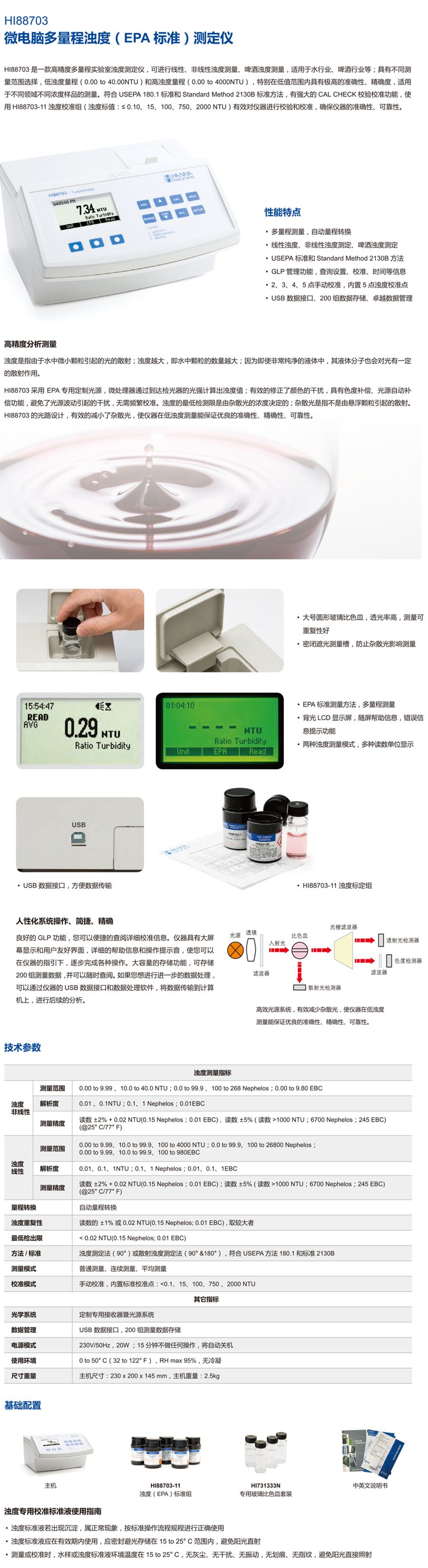 主機,HI88703-11 定制專用濁度(EPA)標準組(標值@25°C:≤ 0.1、15、100、750、2000 NTU),HI731333N 專用玻璃比色皿套裝【6個】,HI93703-58 玻璃比色杯潤滑劑,HI710006 AC230V/12VDC 電源適配器,中英文使用說明書【溫馨提示:建議訂購HI93703-50比色皿清潔液和HI731318玻璃比色皿清潔布,用于玻璃比色皿清潔修復,確保測量精度和讀數準確度】