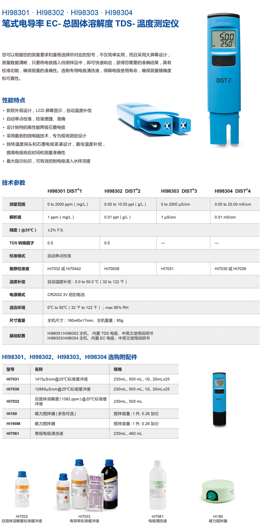 新款外觀設計,超大雙行屏幕顯示,操作便捷,自動識別單點【標準點@25°C:12.88mS/cm,推薦HI7030】識別校準,自動溫度補償,確保測量高精度數據和測量數據可靠性;