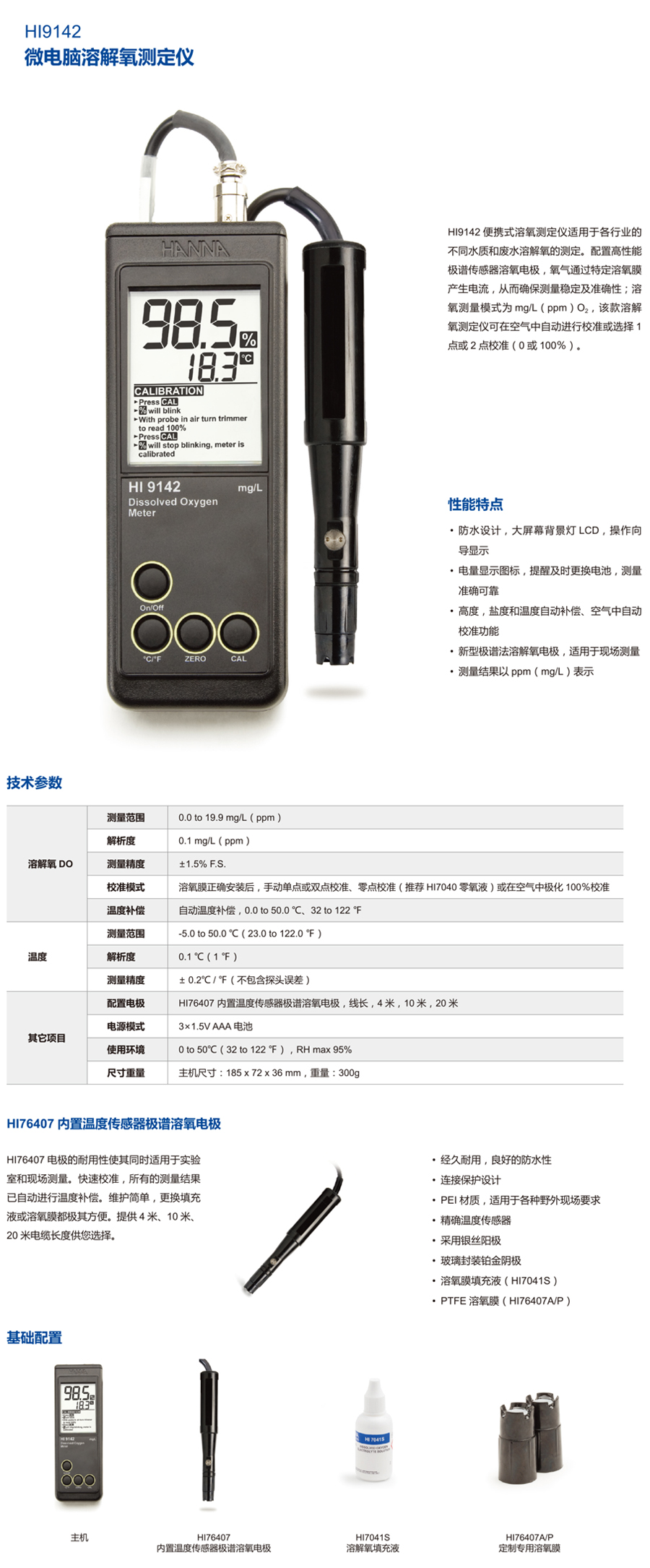 主機,HI76407/4內置溫度傳感器極譜溶氧電極,4米線長,HI76407A/P 定制專用溶氧膜,數量:2個,HI7041S 專用溶氧填充液,規格:30mL,中英文使用手冊,HI721046定制專用攜帶箱