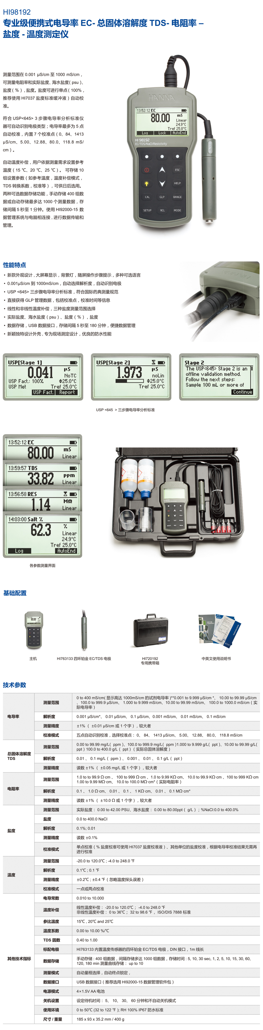 產品描述:高精度EC-TDS-NaCI-°C/oF/K測定儀,大LCD顯示屏,電導率EC-電阻率-總溶解固體TDS-實際鹽度(PSU)-海水鹽度-鹽度(NaCI%)-溫度等常規重要水質指標快速精確測量,自動識別量程范圍及單位轉換;新款外觀設計,隨屏校準操作步驟提示,USP (645) 符合國際藥典測量規范........