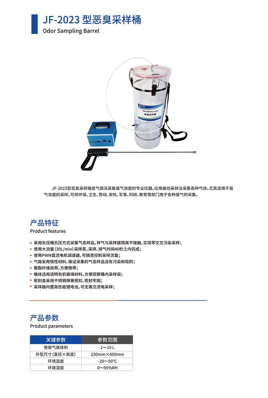 產品描述:JF-2023型惡臭采樣桶是氣袋法采集臭氣濃度的專業儀器。應用被動采樣法采集各種氣體。尤其適用于臭氣濃度的采樣??晒┉h保、衛生、勞動、安檢、軍事、科研、教育等部門用于各種廢氣的采集。